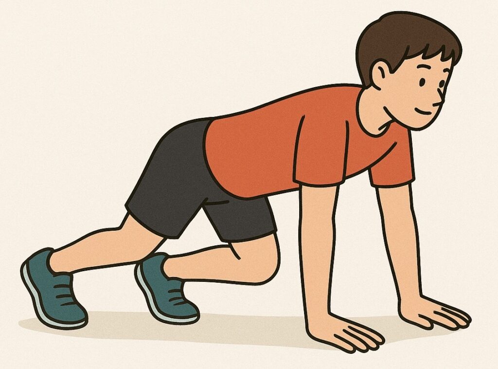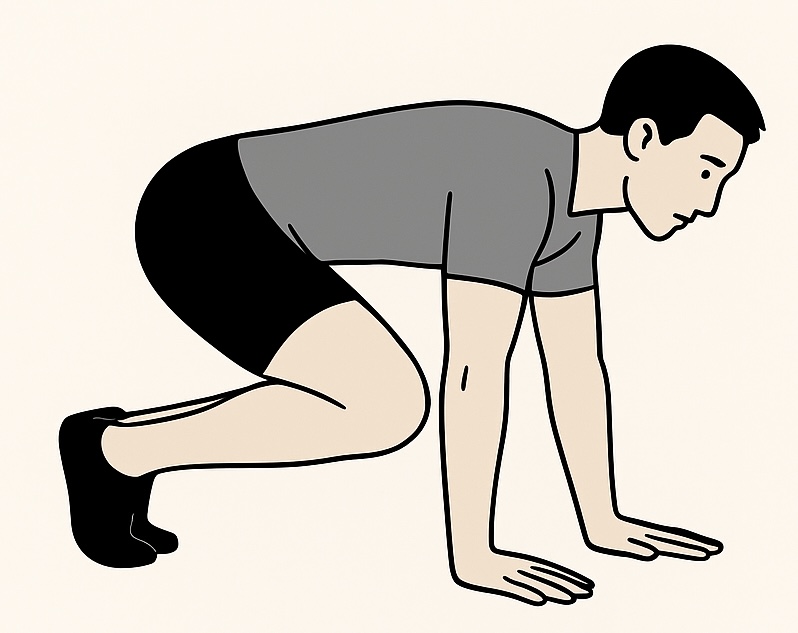 1. 四つ這いから膝を数センチ浮かせ、両手とつま先で保つ姿勢になる。(ビースト姿勢)