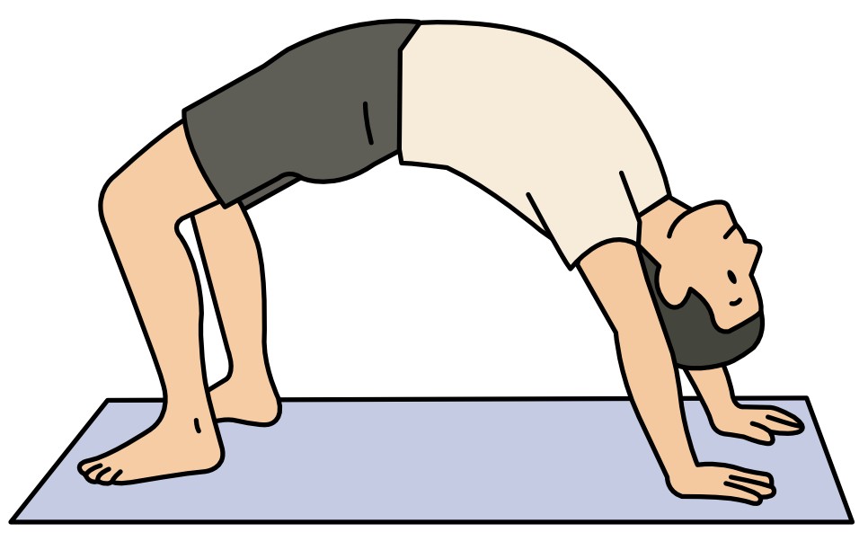 クラブ姿勢(四つ這いの裏向き)から腰を持ち上げ、片腕を反対側へ伸ばして体をひねりながらブリッジに入る。